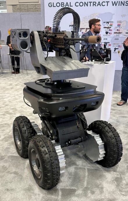 Additionally, they showed the Pitbull RWS mounted to a Deka Sentry Security Platform. This all-terrain, wheeled, multi-mission robot is offered in 3 models with this being the Monster Bot. It is adapted from a carriage for individuals with mobility challenges and is gyrostabilized to offer a solid, upright platform for any application including ISR and weapon employment. For example, it keeps the payload level even when negotiating stairs.